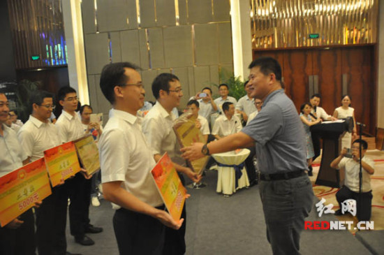 (湖南省住房和城鄉建設廳副廳長姚英杰為第一名張家界代表隊頒獎。)