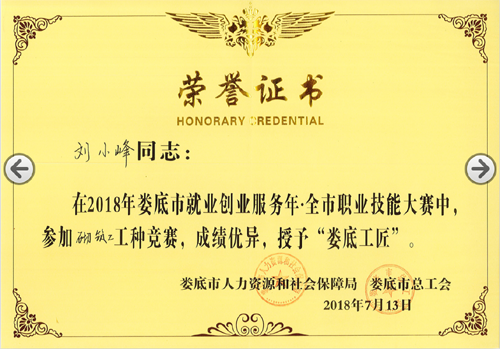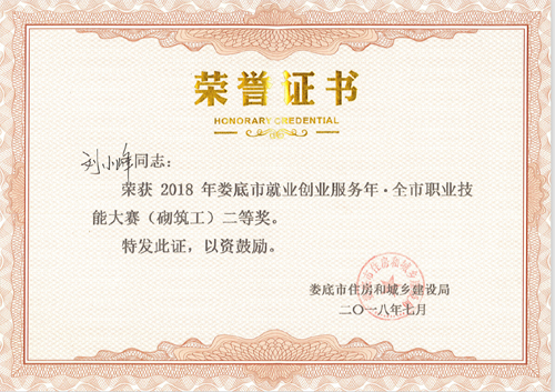 2018年7月13日,由婁底市人力資源和社會保障局、婁底市總工會、婁底市住房和城鄉(xiāng)建設(shè)局主辦的“2018年婁底市就業(yè)創(chuàng)業(yè)服務(wù)年.全市職業(yè)技能大賽”圓滿落幕。我公司選送的參賽選手劉小峰獲職工組砌筑工競賽二等獎,并被授予“婁底工匠”。